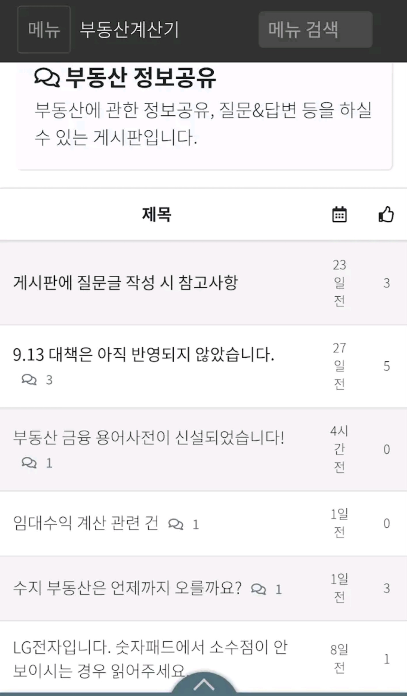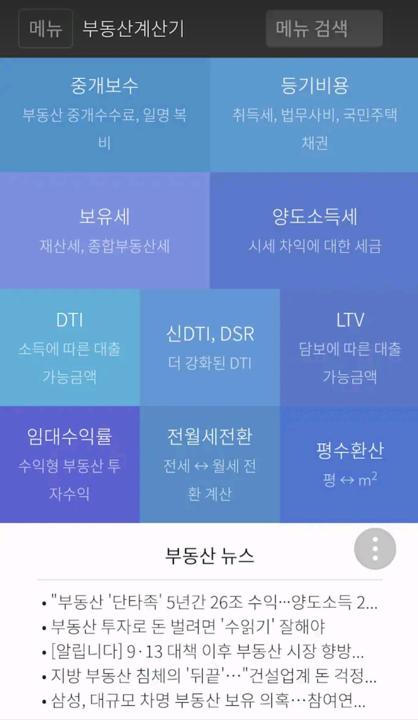 취득세, 재산세, 종부세, 양도세, 증여세, 상속세, 중개보수, 법무비, 수익률, DTI, DSR, LTV 등 계산, 직거래 게시판, 뉴스 등