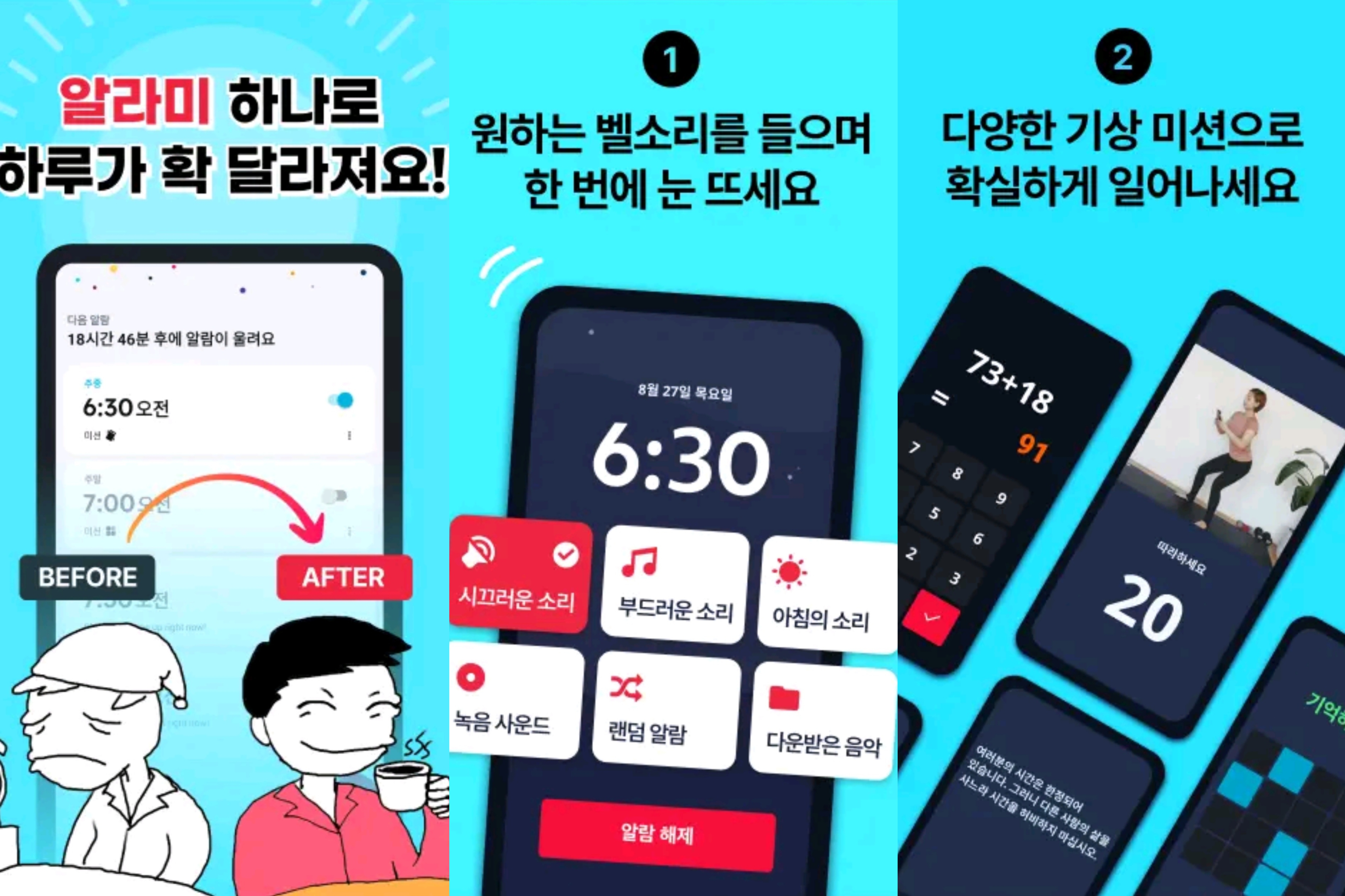 부드러운 소리부터 아주 시끄러운 소리까지! 혹은 좋아하는 음악을 벨소리로 설정해보세요! 그리고 확실한 기상을 도와 줄 여러가지 미션을 선택하여 당신만의 확실한 기상루틴을 만들고 상쾌한 아침을 시작하세요! 기상 후에는 아침 분석을 통해 기상 트렌드를 확인하고, 아침 기분을 기록해보세요!