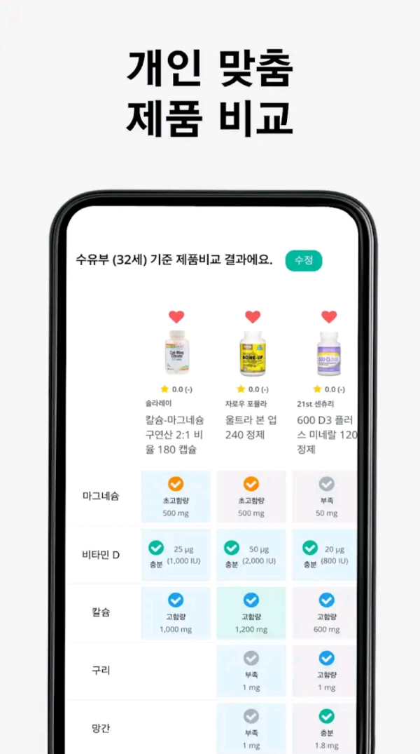 제품의 성분, 함량, 원료를 내 정보에 맞게 비교하세요.