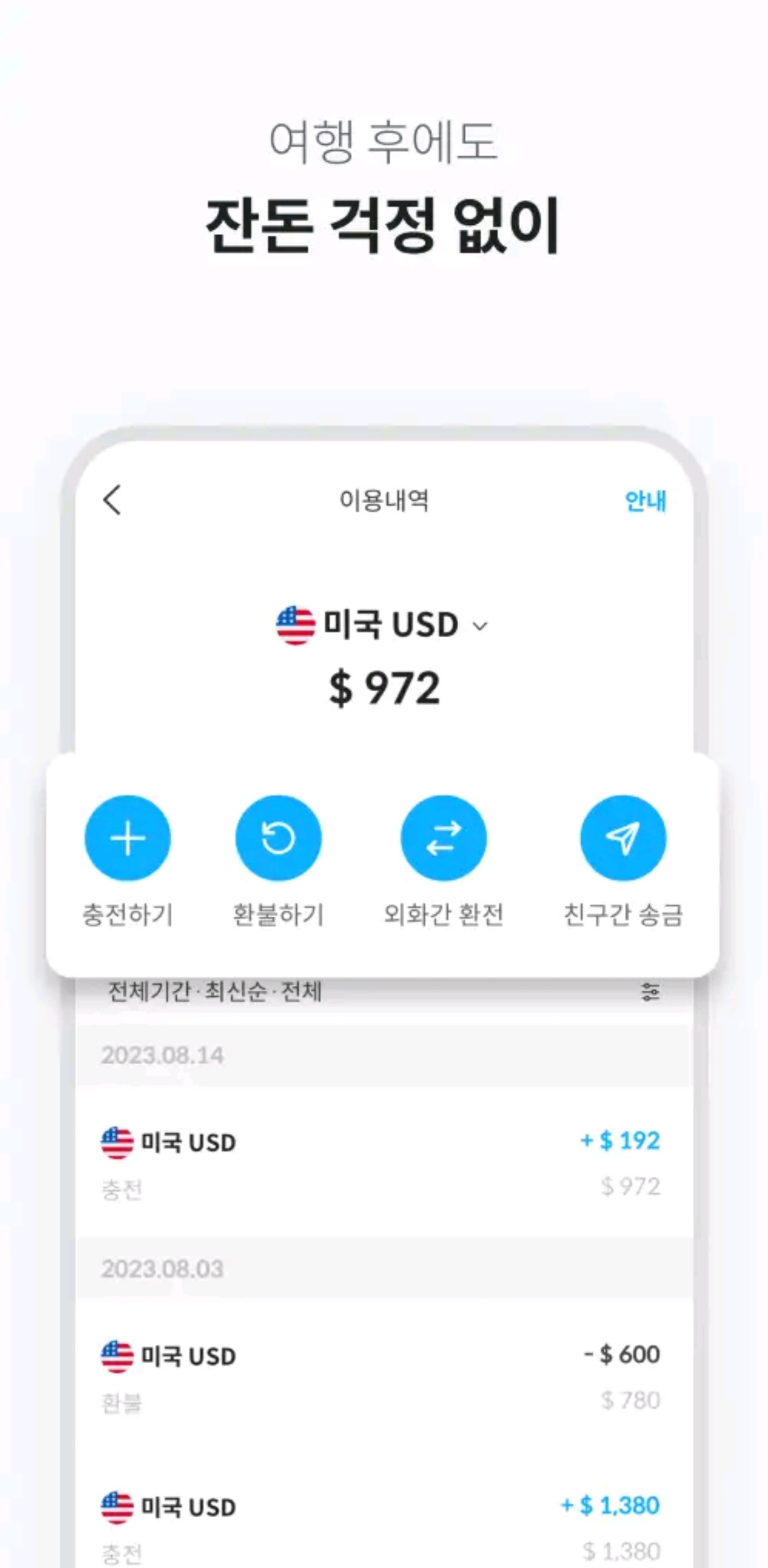 - 38개 통화를 원하는 시점에, 실시간 환율로 충전